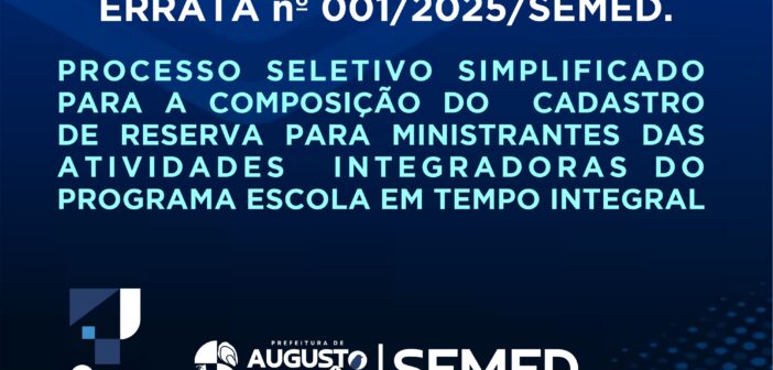 ERRATA PROCESSO SELETIVO SIMPLIFICADO PARA A COMPOSIÇÃO DO CADASTRO DE RESERVA PARA MINISTRANTES DAS ATIVIDADES INTEGRADORAS DO PROGRAMA ESCOLA EM TEMPO INTEGRAL