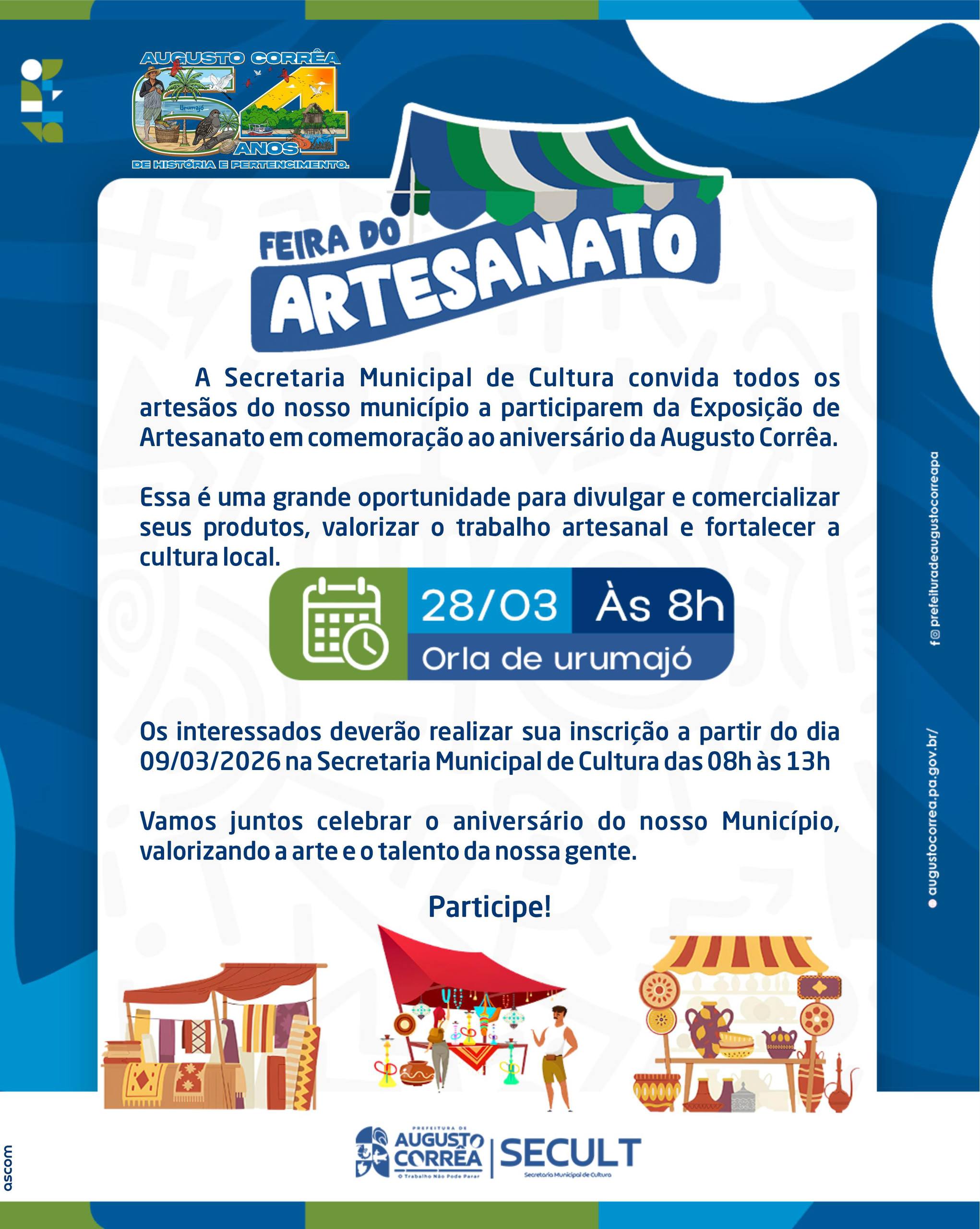 Convidamos você artesão, para participar da exposição de artesanato em comemoração ao aniversário de Augusto Corrêa. Uma grande oportunidade para divulgar seus produtos, valorizar o trabalho artesanal e fortalecer a cultura local.