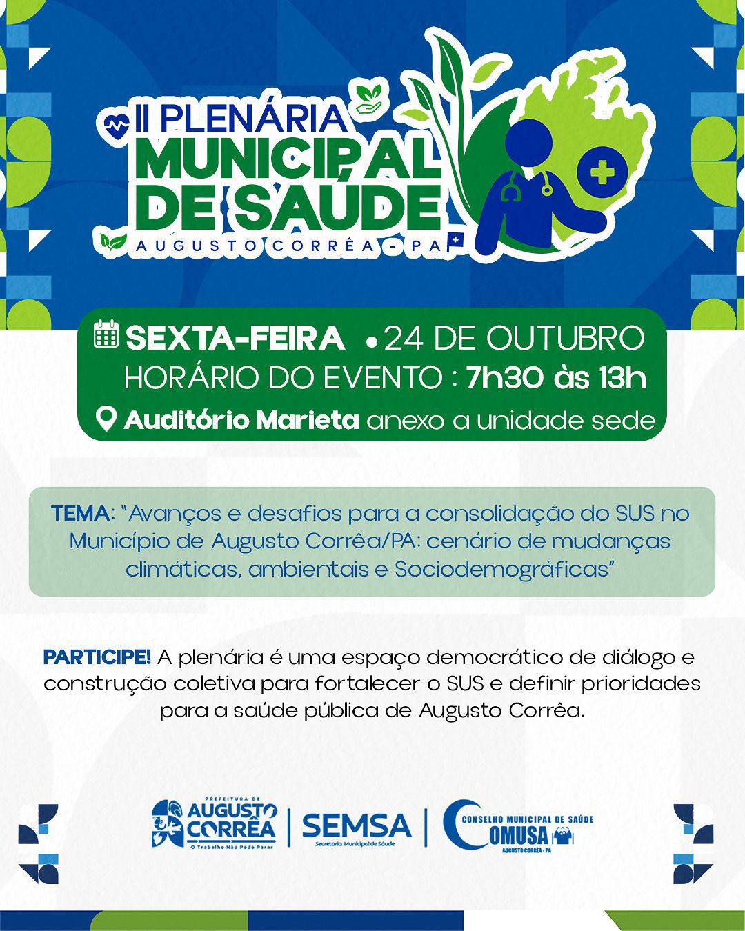 O Conselho Municipal de Saúde, em parceria com a Prefeitura de Augusto Corrêa tem a honra de convidar você para um momento democrático de diálogo de construção coletiva para fortalecer o SUS.🏥🩺